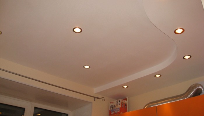 Для маленького помещения или кухни подойдет строгий двухуровневый потолок изысканного оформления с применением точечных светильников по периметру.