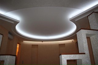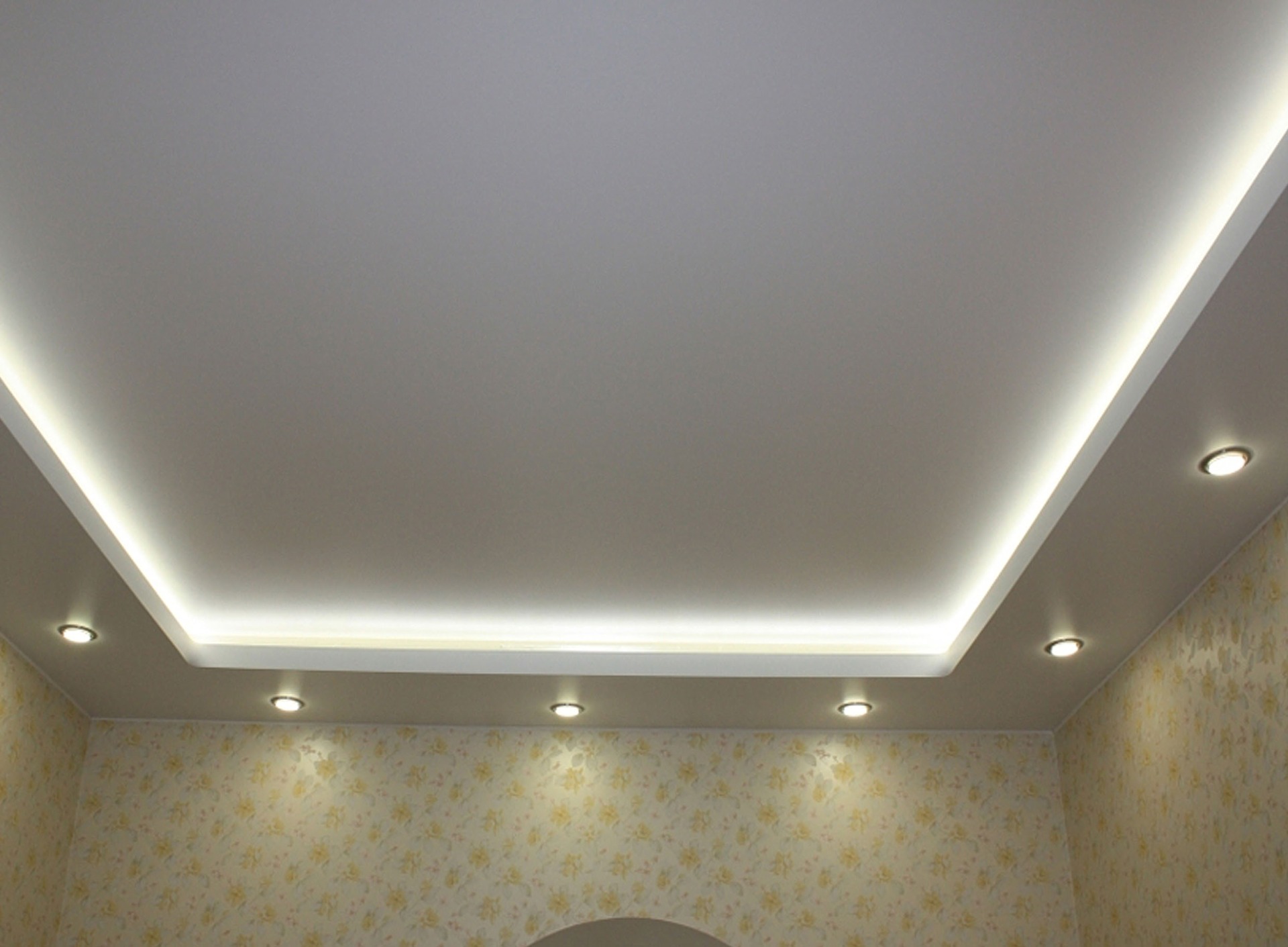 Двухуровневый потолок с подсветкойБазовой основой двух- и трехуровневых конструкций становится базовое потолочное перекрытие или одноуровневый потолок.