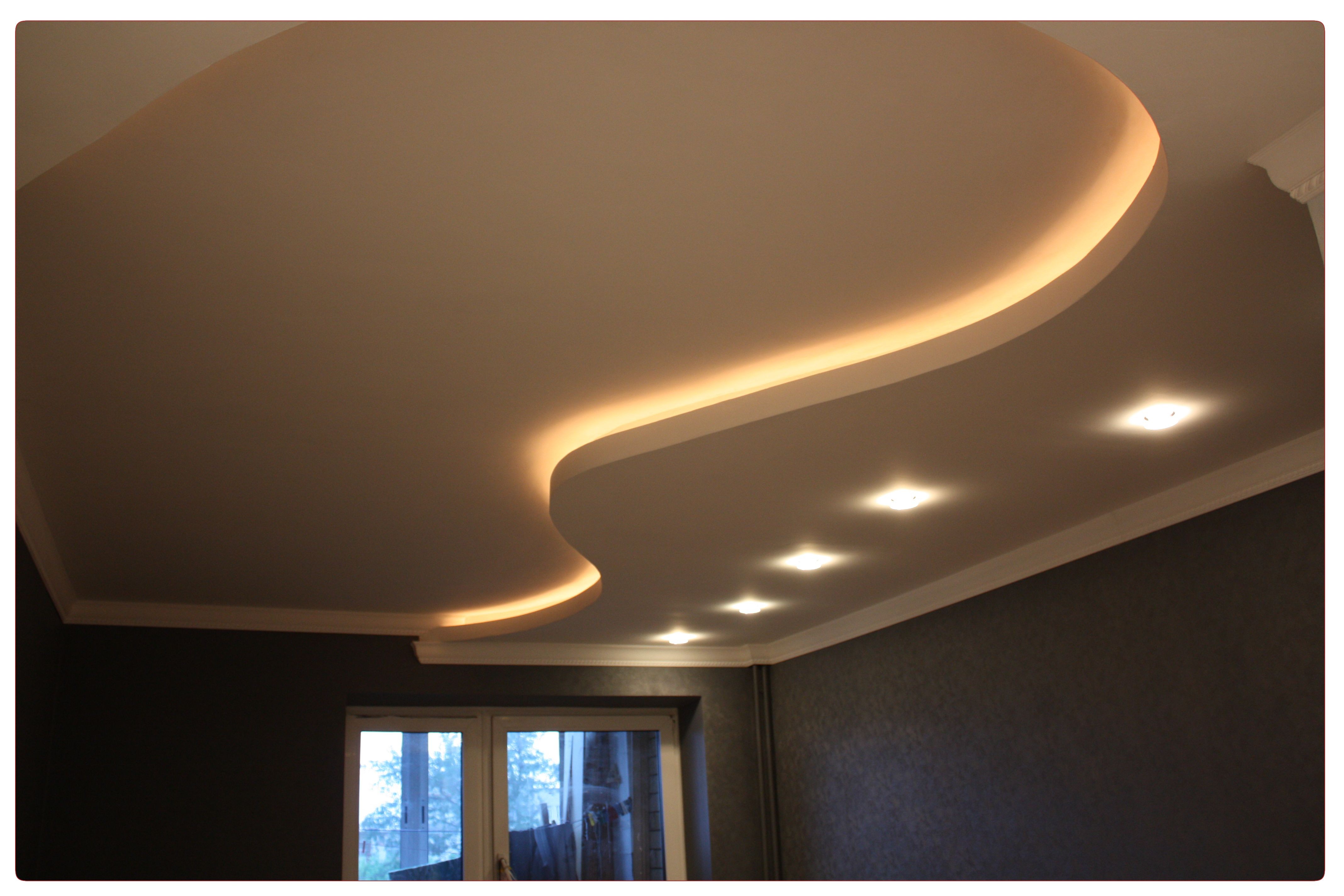 Двухуровневые фигурные потолки дают возможность сделать дизайн комнаты изысканным и неповторимым, использование гипсокартона для их изготовления позволяет получить декоративную изюминку интерьера быстро и сравнительно недорого.